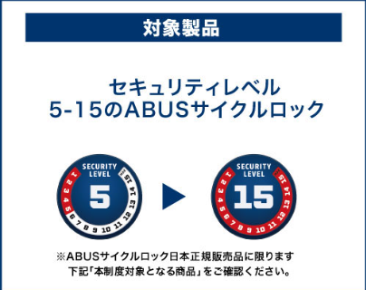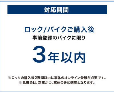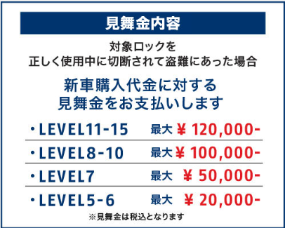 ロックを正しくご使用頂いていたにも関わらず、ロックが切断され自転車の盗難に遭われた場合に、お見舞金をお支払いする制度。ロックご購入後、2週間以内にオンラインにて、製品登録が必要です。