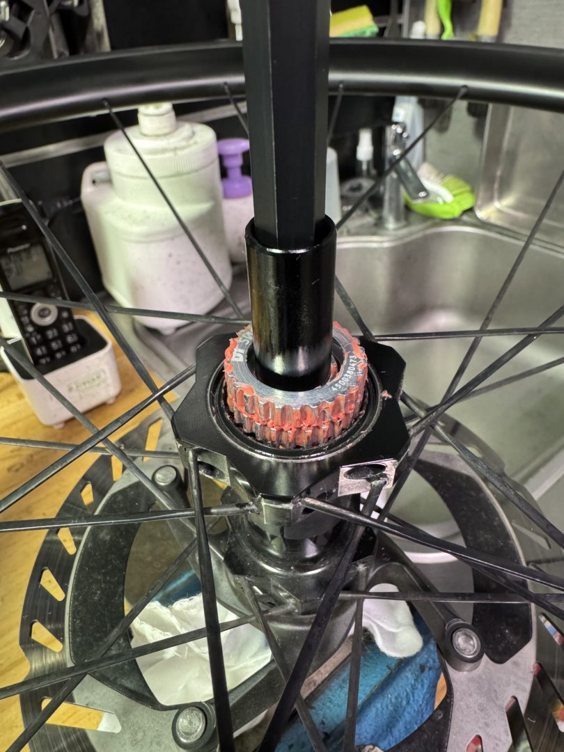 カセットを外したらピンク?色の専用グリスが塗布しているはずですが、なくなっています。おそらく中古で購入してきたホイールなので、前所有者がメンテナンスをしていたか、使用頻度によって変わってきますね。グリスがなくなると、2個の重なる爪がダイレクトに当たるため、少なからず消耗は早まります。ただ爆音になるので好みは分かれるかと…爆音にしたくても薄くは塗布したほうがいいです。メンテナンス頻度は増えますが。