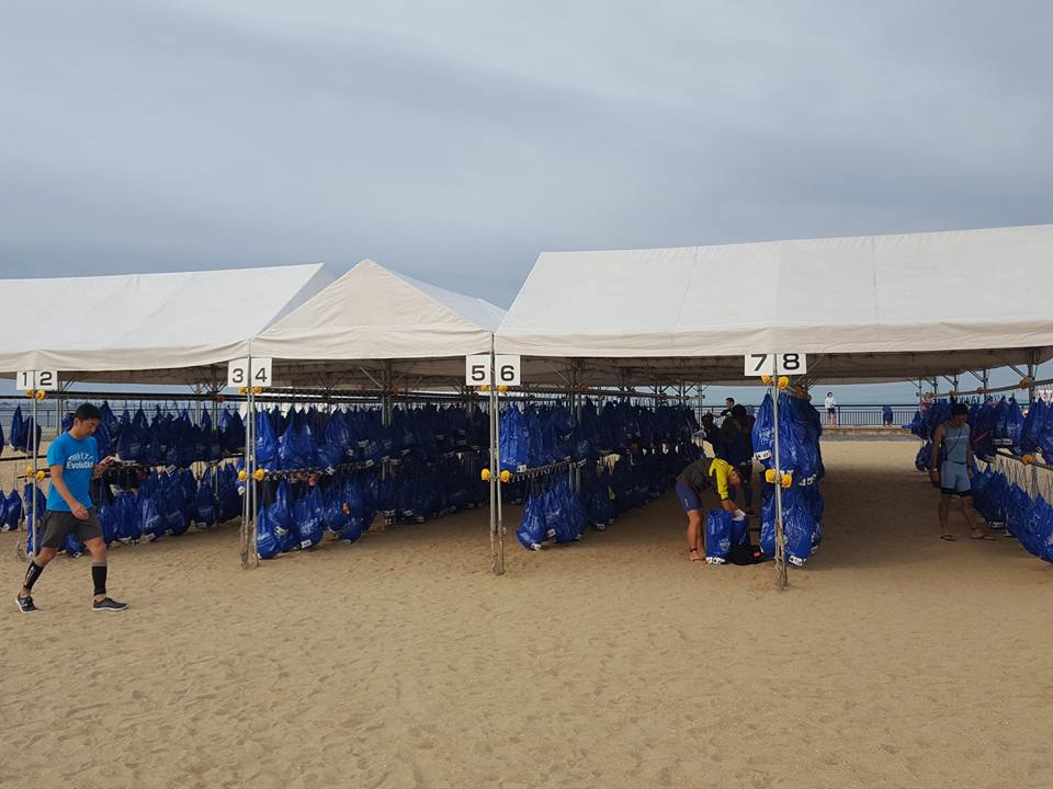 トランジション1(スイム→バイク)で使用する袋もスタートエリア近くのテントに預けます。