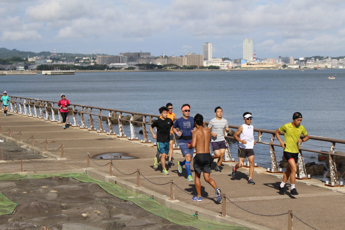 朝は風もなくまだ涼しいので早速準備体操して、横須賀のランニングコースの定番まぼちょく(馬堀の直線約1.5Km)までジョギング。