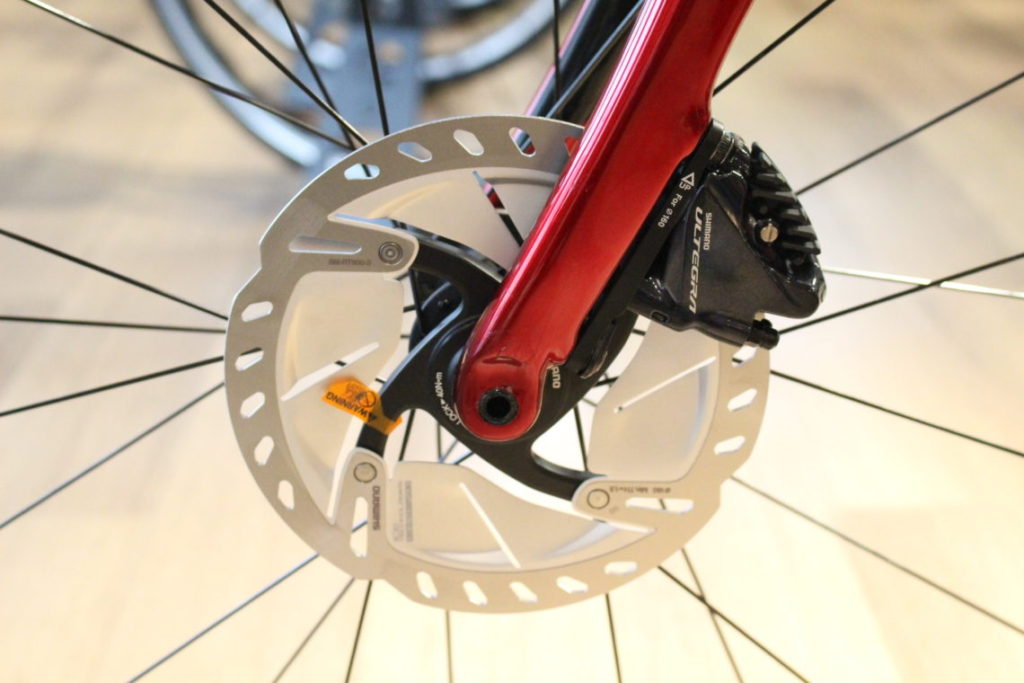ロードでもディスクブレーキがスタイリッシュにつきます。スルーアクスルによりエンドの剛性も上がっていて反応もいいですよ。