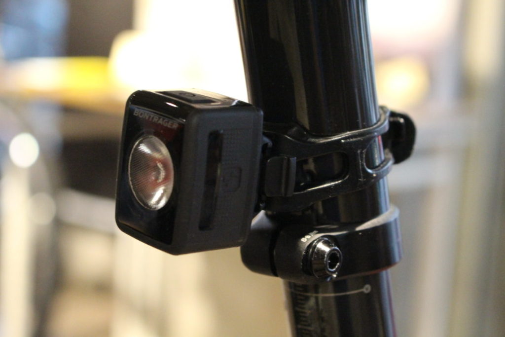リアライトは最新のボントレガー『Flare RT USB』。明るくなってかなりスマートになりました!ボントレガーの一部ライトは昼間でもしっかりライダーが目立つように独自の点滅、焦点、照射幅で設計されています。ライトは昼間でも常に点灯しましょう。