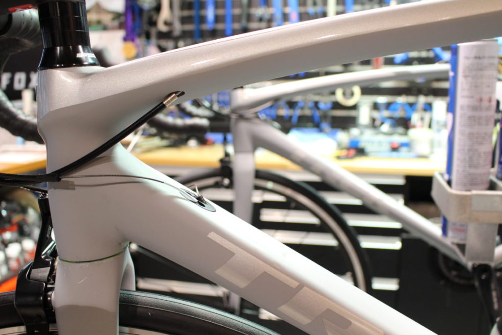 これアルミフレームなんですよ。溶接の跡がほとんどありません!EMONDA SLRに乗っているお客様からは「カーボンと見た目変わらない。」と言うお言葉も多いです。ワイヤー類はフレームの中に通るので見た目スッキリカッコいいですね。