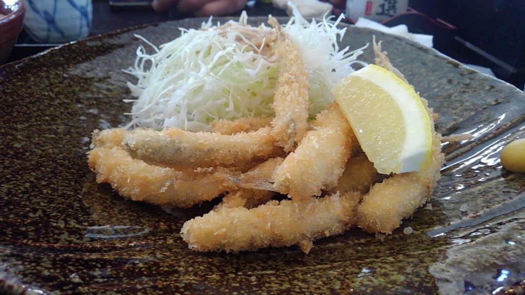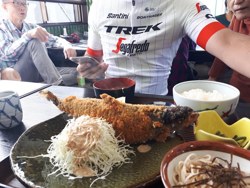デカ!!!みんな注目です(後ろの団体さんも覗いています)。ますのフライ!?ついさっきまで泳いでいた新鮮なますを丸ごと一匹。美味しそうでしたが食べにくそうでした…