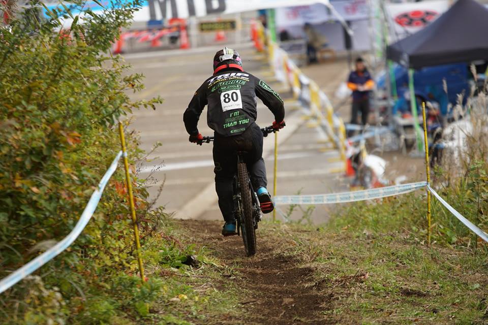 はい、トラブルですね。チェーンが外れていて中盤から漕げなかったそうですがアーロングウィン並みの技術で何とかゴール(専門用語ですみません、アーロングウィンとは世界最高峰のワールドカップでスタートと同時にチェーンが切れたにもかかわらず優勝しちゃったすごい選手です)。笑顔なので結果は2位と4秒差つけて優勝!!さすがです。ダウンヒルって奥が深い…スピードが落ちないようにプッシュプルと言う技術でゴールを目指したそうです。