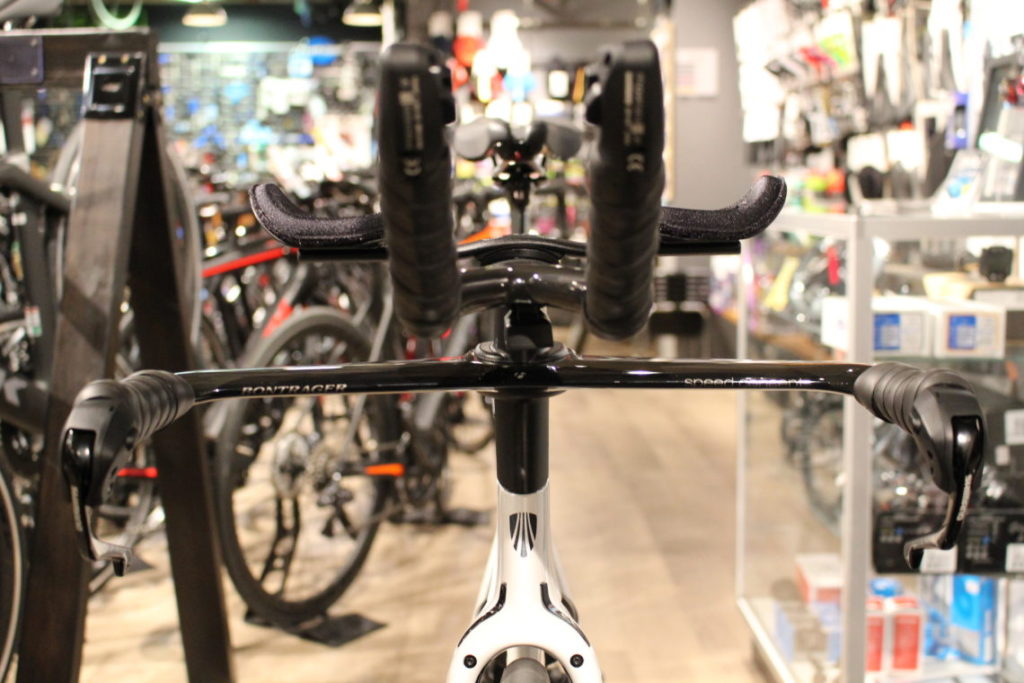 スピードコンセプトと言えばエアロですね。MADONEもありますがこちらはTT(タイムトライアル)とトライアスロン専用になります。前から見るといたるところが細くなっています。ハンドルも専用で基本的にエアロポジションがとりやすい設計になっています。