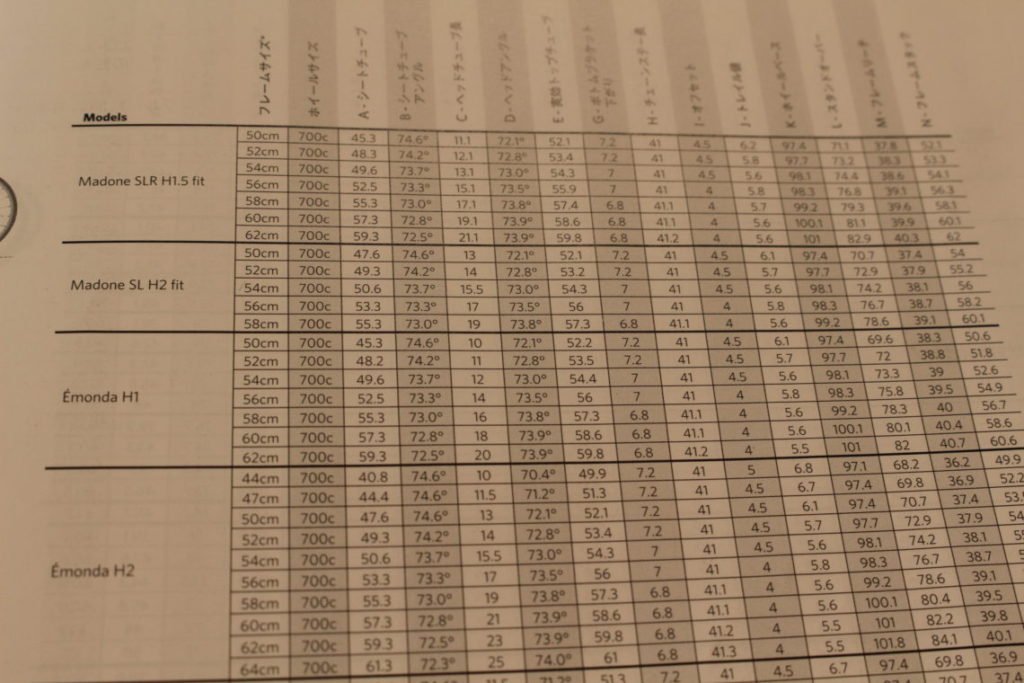 よく見るとMADONEにはH1.5fitとH2fitがあり、EMONDAにはH1fitとH2fitがあります。それ以外のロードバイクには何も書いていません。それ以外は基本的にH2fit。ただDOMANEシリーズはまた専用のエンデュランスジオメトリーを採用しています。