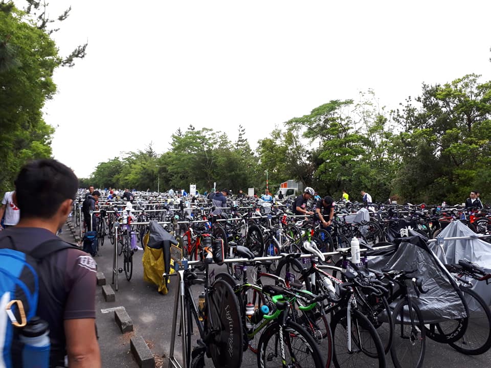 競技説明会、受付を済まして空港内でランチ。そのあとは、スタート、トランジション1エリアへ向かってバイクチェックイン。スタートは空港から車で25分離れた、新舞子マリンパークになります。駐車場に着いたら、まずバイクを組立て点検して、T1T2で使うトランジションバックに荷物を詰めてT1エリアにバイクチェックイン!