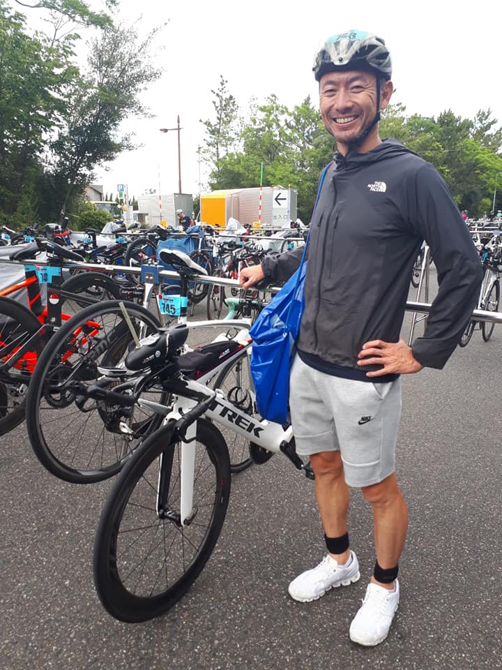 青木さんもバイク設置完了!いつもはショートディスタンス(オリンピックディスタンス)をメインに出ており、表彰台にも乗ったりしていて、3種目すべて速いんです。今年は9月にスイスの世界戦も控えています。今回のミドルディスタンスは初めてで、勉強のためにと出場しました。カラーオーダーのトレックスピードコンセプト、カッコいいですね~青木さんは私のスタート後15分でスタート、スイムで追いつかれないように私は必死に逃げます(笑)