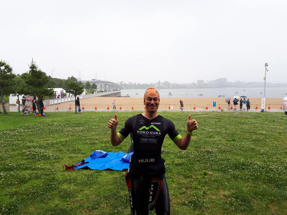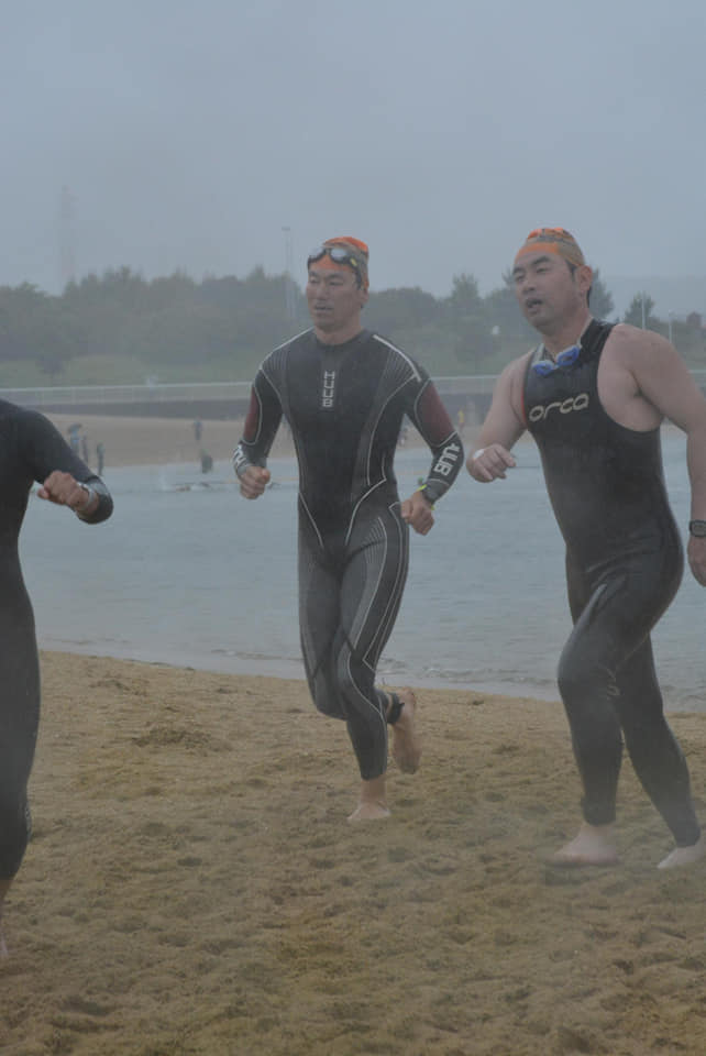 スイムウォームアップ(試泳)時間もありましたが、上がってからスタートまで1時間以上待たなければなかったので、寒さもあったので試泳はせずギリギリまでジャケットを着て雨宿りしながらスタートまで待機。試泳した方は震えて寒そうにしていたので、今回は試泳しなくて正解でした。スタートは私が8時15分スタート。青木さんは私の後8時30分スタート。スタート前に少しランニングして5分間だけ水に入って泳いで準備はできたのでこれで今回はOK。雨は降っていましたが全然寒くなかったです。水温もおそらく20℃前後で私の中では暖かく感じ、波、風も全くなかったので泳ぐにはベストコンディション。
