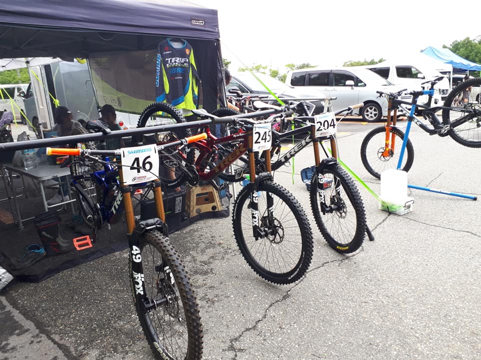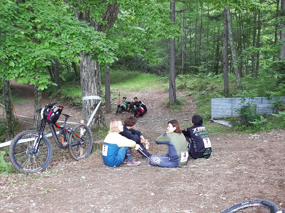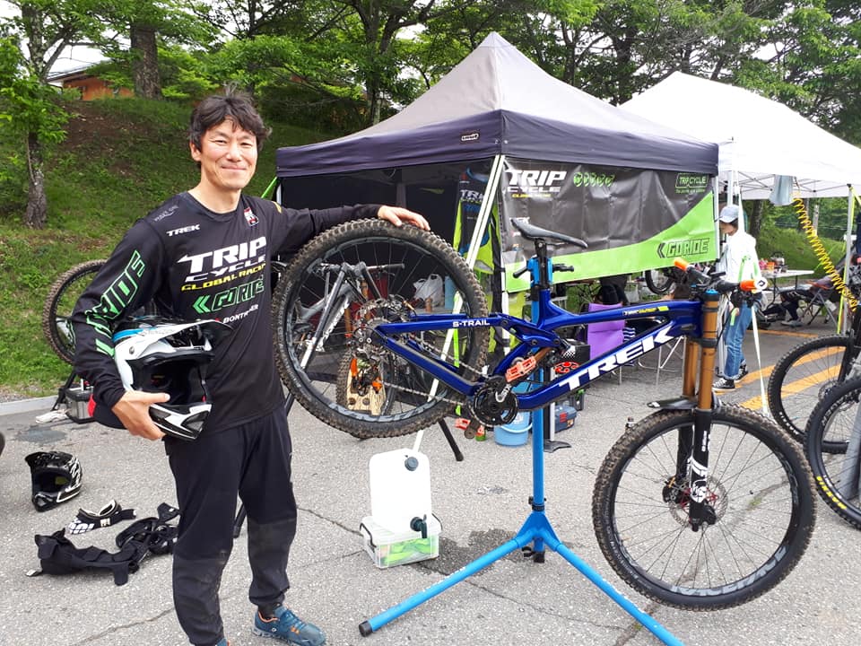 トリップサイクルには実はマウンテンバイクのチームもあるんです。「TRIPCYCLE GLOBAL RACING」(トリップサイクルグローバルレーシング)、ちょっと固そうな名前ですが、中身はゆるゆるとマウンテンバイクを楽しみながらやっています。今回はダウンヒル競技のみ5人がエントリー(クロスカントリーメンバーもいます)。