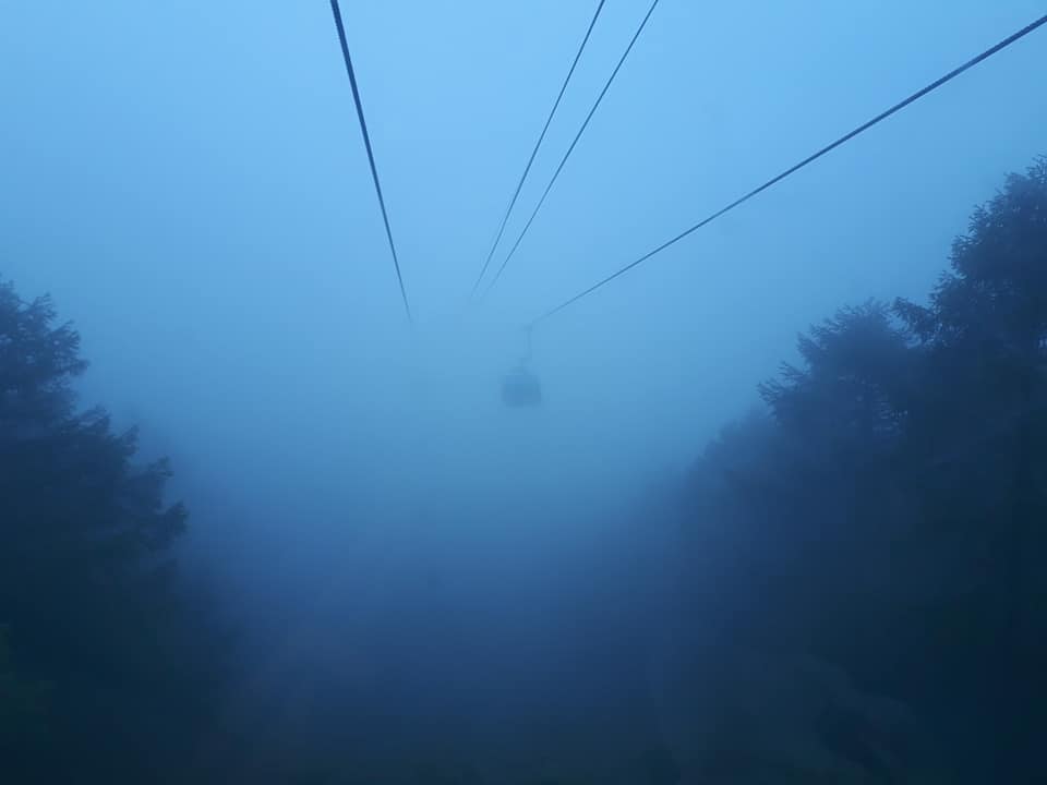ゴンドラで山頂へ向かうんですが、中腹辺りからはガスがかかって何も見えません。