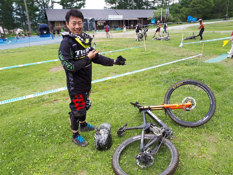 まずは、今回初ダウンヒルレースの鶴川さん。ダウンヒルはまだ数回しか走っていないんですが、センスがいいので上達が早い。チャレンジクラスは予選はなく一発決勝、ゴールで見守っていましたがヘルメットとゴーグルの間に葉っぱがひらひらしていたので(笑)、1回転んだそうです。でも無事けがもなくゴール!17位と目標の完走ははたせました。悔しかったですが、次回に期待できそうですね!