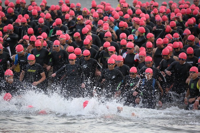 試泳をしてスタートに備えます。水温24℃、かなり濁っていて透視度は1mから2mってとこ。なんといっても風が意外と強く時折白波もたち、沖に行くとうねりもありました。こんな状況で正直4Kmは泳いだこともないしかなり不安でしたが、今シーズンはIMセントレア70.3も遅いですがラクに泳ぎ切っているので大丈夫だろうと秘かに自信もありました。