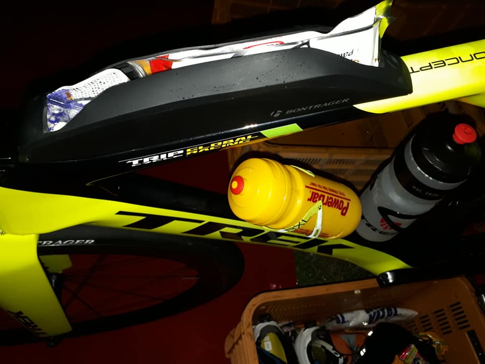 ヘルメット、ゼッケンベルトはハンドルに。バイクシューズやランシューズなどはオレンジのかごの中に全て入れます。