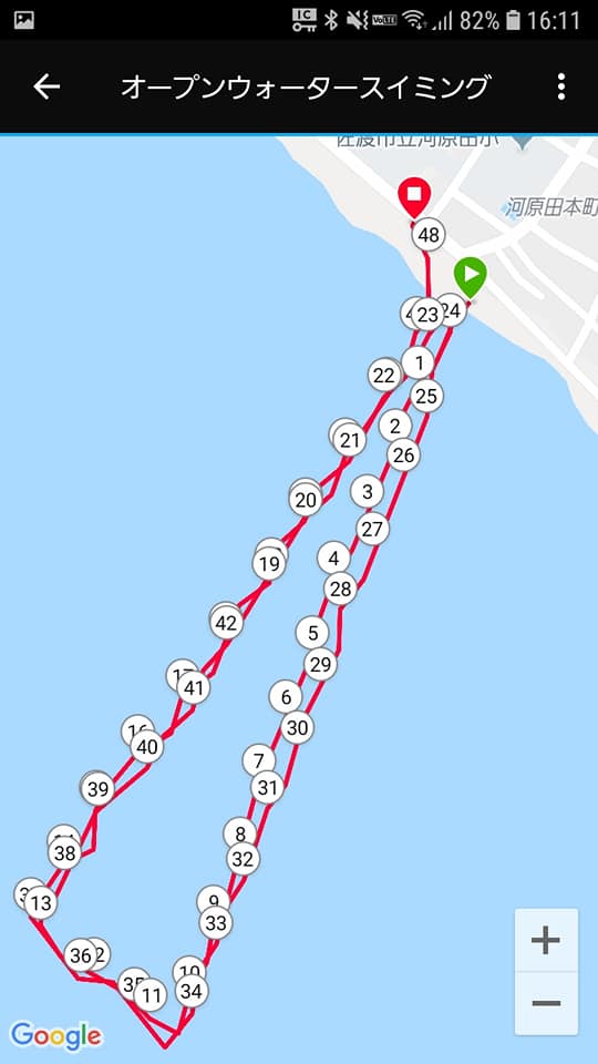 無難に1周(2km)して、後ろを見ると「いつもより意外と人いるな~」と思ったのと、意外とみんなスイムで苦戦しているようでした。タイムは55分。この状況でこのタイムは自分的には「まぁまぁかな」と思って2周目に突入。2周目は1周目よりバトルは少なかったので、いろいろ考えながら泳いで、1周目と同じタイムで上がれました。OWSの練習は結構していたので海には慣れていて、パニックになることなく冷静に4Kmを楽しむことができました。(今までで一番楽しかったかも)
