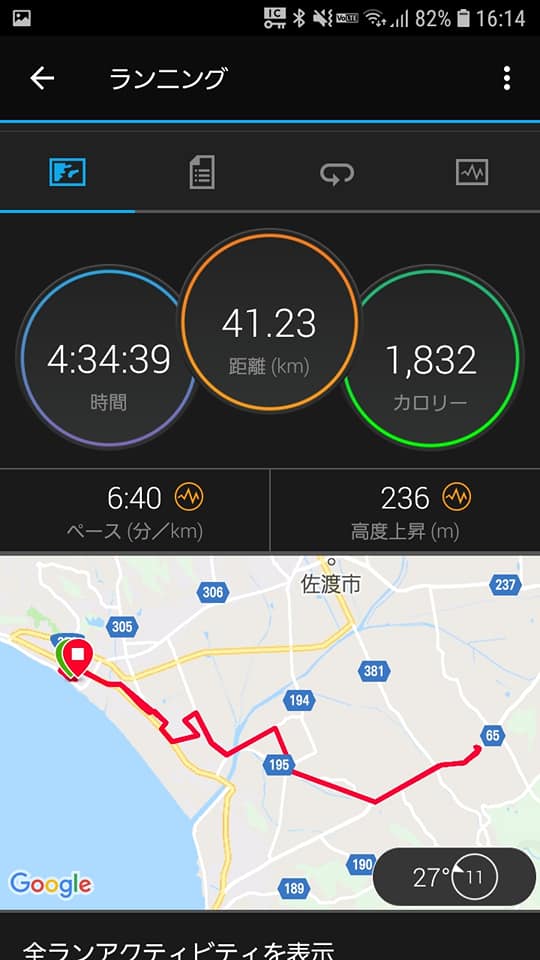 佐渡Aタイプは21.1Kmを2周する、基本平坦で折り返し地点手前は少し登りになるコース。スタート後は意外と足が動き、3Kmまで5:30分/Kmペース明らかに飛ばしすぎですが、いつものことでここからどんどん落ちてきます。1周21.1㎞終えて、ペースは6:30分/Kmペース。気持ちは「まだ1周あるのか…」と一瞬思ったが、ここでKONA6連覇したマークアレンさんの言葉「ゴールした時にどう思うか、後悔しないような終わり方にする」を思い出し、応援してくれてる方のことを考えながら走り続ける。きついのは最初から分かっていることなので、なるべくこの時間を楽しむ。