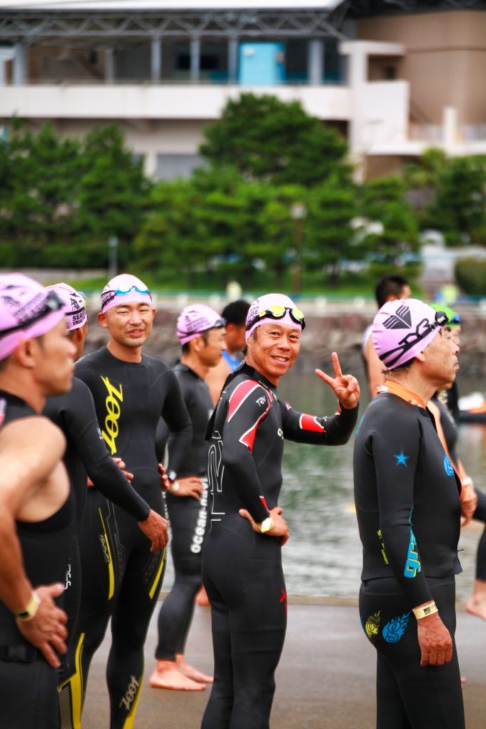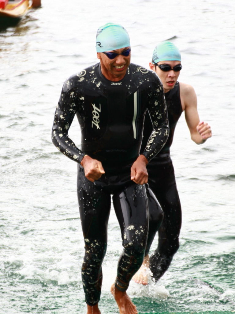 そしてKさん(30歳代)とHさん、初出場にもかかわらずスプリント種目(スイム750m)で参加。Hさんは50歳代でデビュー。ちなみにトライアスロンは年齢関係ないです。自分のやる気次第です。Kさんはスイムが得意でHさんはランが得意。お二人とももちろん練習頑張ってました。終わってみればHさん49位、Kさん50位とその差4秒差!!若い物にはまだまだ負けません。まさかこんな近くにライバルがいたとは(笑)。これからお互い高め合ってほしいですね。