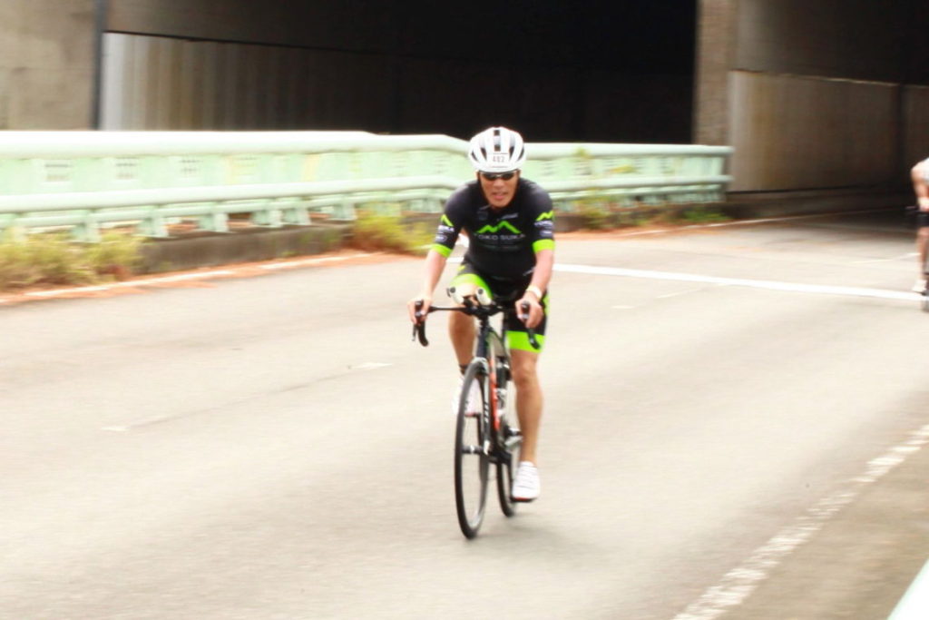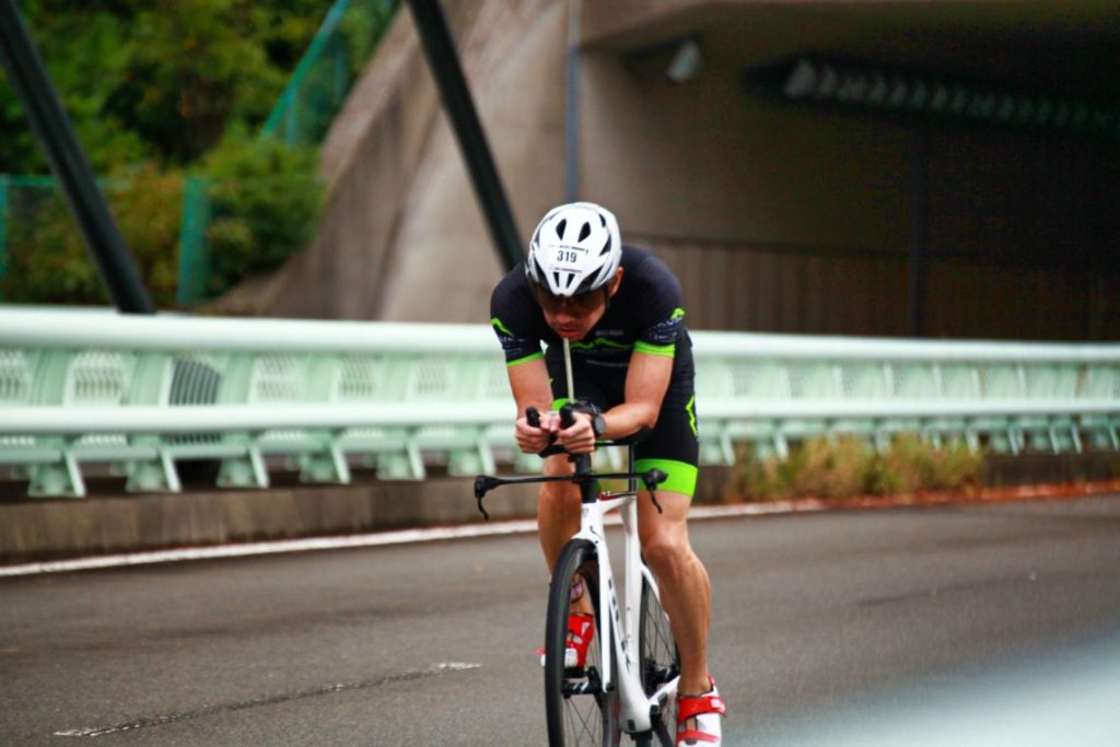 スイム高橋さんは5番手で上がってきました。トップともそんなに差はないので流石です。ここで計測バンドを受け取り、トランジションエリアに向かいます。今回台風の影響でコースが一部変更でスイムアップからトランジションエリア入り口まで一時タイムストップと言う前代未聞のルール、走ると滑る路面なので歩きのみ。この区間は少し休んでもOK(笑)、ウェットをここでゆっくり脱いでバイクの準備することもできます。これがなかなか好評で楽しくて良かった。そしてトランジションエリアに入ってからは一気に走りバイクをピックアップ!ここまではバッチリ。今回は初めてバイクにシューズを付けた状態(裸足で自転車に乗る)からスタート。バイクに乗ってシューズを履くのに少し手間取りましたが、ここから20Km追い上げていきます。