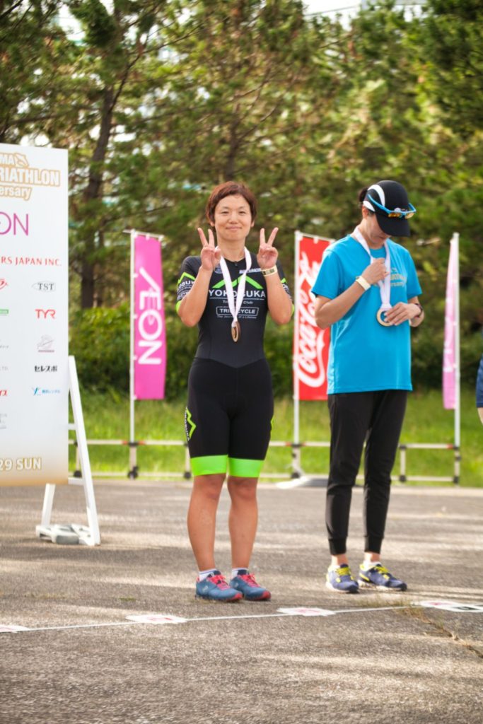 今回唯一の女子、Wさん。大会2週間前に新潟の村上に出場して惜しくも4位で表彰台を逃してしまったので今回は狙ってましたね!?Wさんはスイムがかなり速くて、バイク、ランは今、成長期。今回は個人的に期待していましたが、それに応えてくれてエイジ3位!表彰台ゲット!!やったー。