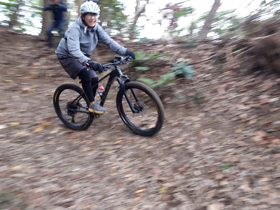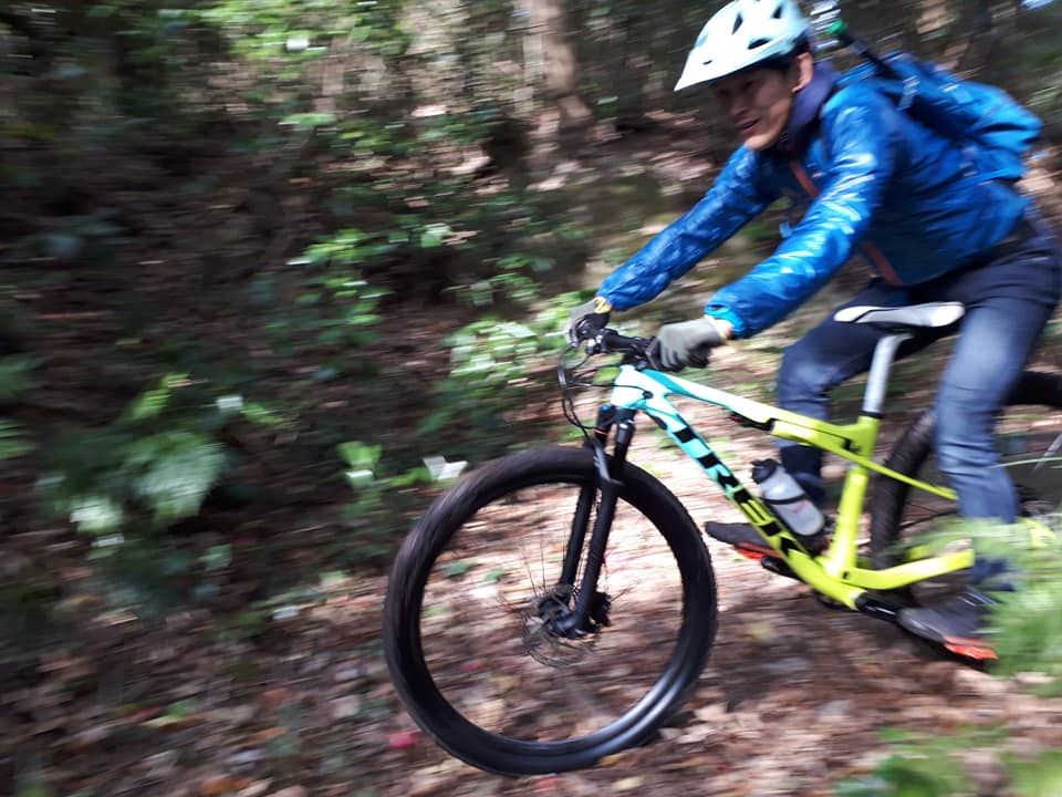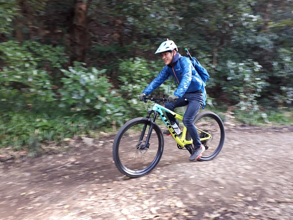 普段はロードバイクに乗っているだけあって、基本動作を教えながらすぐに慣れて、落ち葉でふかふかのトレイルを楽しんでいました!「楽しいです!」を連発。そう、マウンテンバイクは楽しいんです。静かな山の中を走るのはロードバイクにない楽しさ。