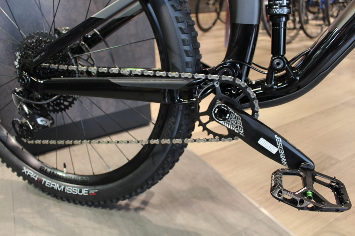 変速系は主流となっているSRAM GX Eagle 1×12。 シンプルでチェーントラブルも少ないです。ペダルは付属しないので、滑りにくく耐久性も高いレースフェイスのATLASペダルをチョイス。