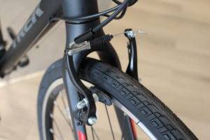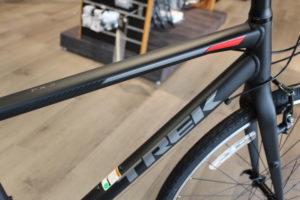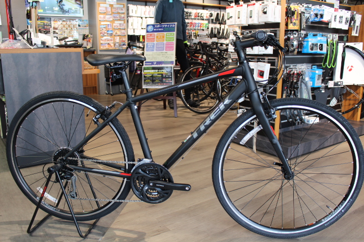 2019年モデルの人気クロスバイク「FX3」。カラーは人気のブラックです。最新2020年モデルとの大きな違いはブレーキです。トレック2020年モデルクロスバイクは全てディスクブレーキ仕様になりましたが、こちらのモデルはリムブレーキモデル(Vブレーキ)となっています。ブレーキの効きはディスクブレーキに比べると少し落ちますが、街乗りや通勤、通学などでは快適に乗ることができます。ミドルグレードのFX3は車体も比較的軽く、走行感も軽く抜群の安定感を持ちます。在庫カラーはブラック、サイズはMとL。その他カラーサイズはメーカー在庫あればお取り寄せも可能です。お気軽にお問い合わせください。