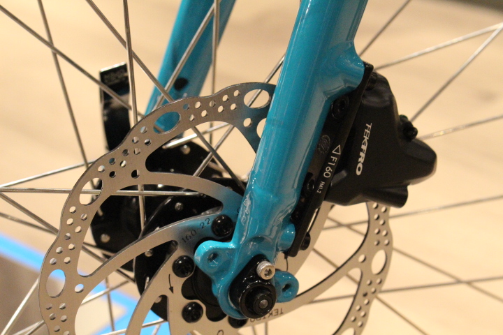 女性でも軽い力でしっかり止まる、安心の油圧式ディスクブレーキ。急な雨や泥汚れなどでも制動力はほとんど変わらないので、握力がなくなることもなく快適です。休日のサイクリングや街乗りにも最適です。