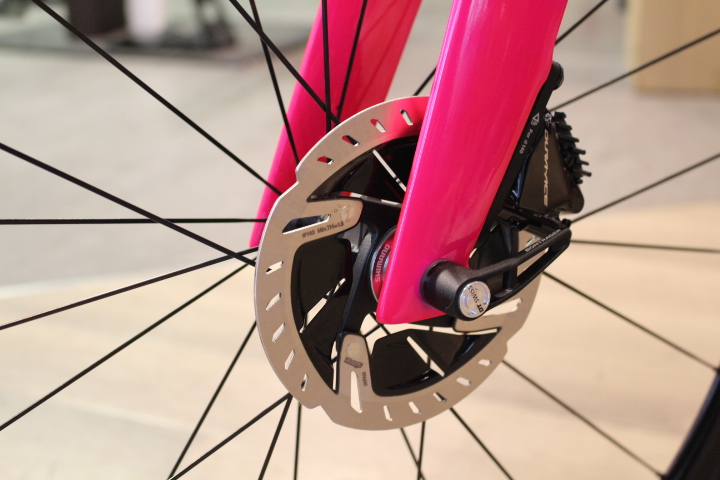 ホイールはBONTRAGER(ボントレガー)のカーボンホイール「AEOLUS XXX 6」。マドンにはやっぱりディープホイールが似合います。私(篠原)も同じホイール使用していますが、巡航性能が抜群にいいです。