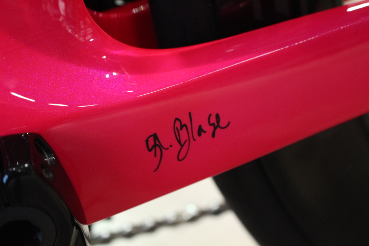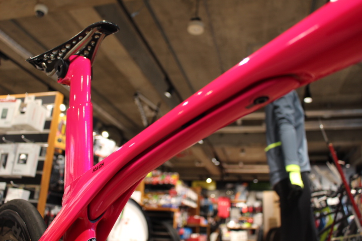 フレームのメインカラーは Radioactive Pink (レディオアクティブピンク)、蛍光色でかなり明るいピンクです。お客様は男性ですが、このピンクは流行りなので男性女性関係なくカッコいいですね。
