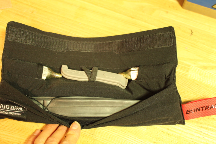 今回は専用のバックにチューブ、タイヤレバー、CO2ボンベ×2本を収納。問題なくフレームに納まりました。携帯用ポンプは手動とCO2のハイブリッドタイプなので、ボトルケージ横に専用の台座で固定しました。
