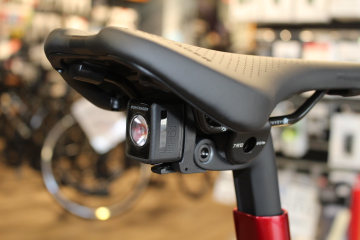 リアライトはボントレガーのFlareRT。サドルの真下に専用のブラケットでスマートに取り付けられます。