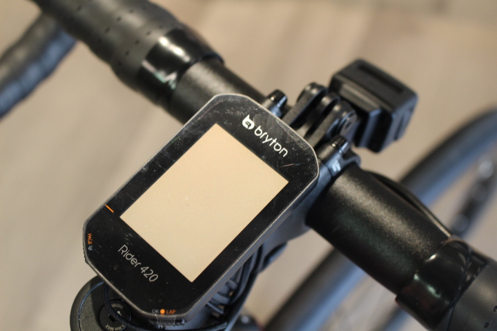 フロントライトもブレンダ―システムでスッキリ収め、ここ最近人気の高いGPS付きサイクルコンピューター「BRYTON(ブライトン)」のRider420を取り付けました。ブライトンはGPS付きで高機能にもかかわらず、コストパフォーマンスが抜群なので、初めてのサイクルコンピューターとしてもおすすめです。