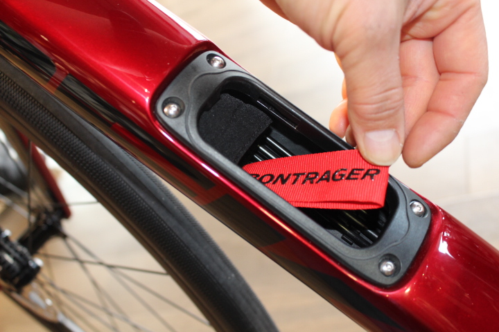 ダウンチューブ内にはパンク修理キッドなどが収納できます。サドルバックに収納するより低重心化になるので、バイクがより安定します。見た目もスッキリしますね!