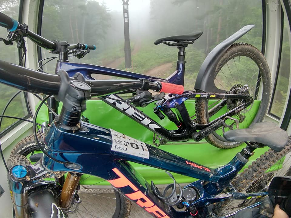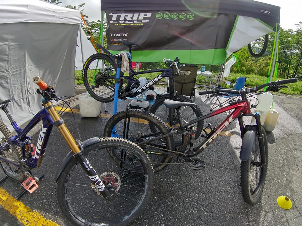 バイクは普段(ダウンヒルレース)ならトレックのダウンヒルバイク「Session(セッション)」ですが、コースが長く漕ぎが多いのでおろしたての「SLASH(スラッシュ)」で参戦!!スラッシュはとにかく漕ぎが軽くよく進む、そしてダウンヒル性能もセッションに劣らない性能。最新バイクは本当にすごいなと思います。ゲレンデダウンヒルなど楽しむならオールマイティーに扱えるスラッシュがおすすめです。上の写真は手前がお客様のスラッシュカーボン、奥のリアフェンダーがついたのが私のスラッシュ。2台ともカッコいい~。