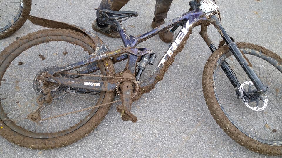 3日(土)予選、決勝当日。天気は昨日とは打って変わって快晴。昨日の状況から快晴になると路面がどうなるかといいますと、最悪の地獄沼になるんです(笑)。ダウンヒルレースをやっている人ならみんな知ってます。こねられた泥はそのまま半乾き状態になり、タイヤやフレームに泥がどんどんくっついていくんです(車体重量+5Kg以上)。一本目の練習走行、案の定スタートからバイク全然進みません。コースの8割が田んぼ状態でジャンプするリップ(飛び出しの登り2mくらい)も全力で漕がないと登れません… ジャンプコースなのに一切ジャンプできません(笑) 一緒に走っている岩﨑選手も途中待っても待っても来ません。私はなんとかゴールまで走り切れましたが、ライダーのほとんどはゲレンデ(コース外)を下ってきたそうです。とりあえず洗車とセッティングで練習は1本で終わり、てかあんなとこもう走りたくありません(笑) 泥詰まりしやすい、フロントフェンダーを取り外し(リアは問題なかったので装着したまま)、前後空気圧を2.0BAR(普段は1.5前後)まで上げ転がり重視! ほとんどタイヤが10cm以上埋まるのでグリップとかもう関係ありません(笑)