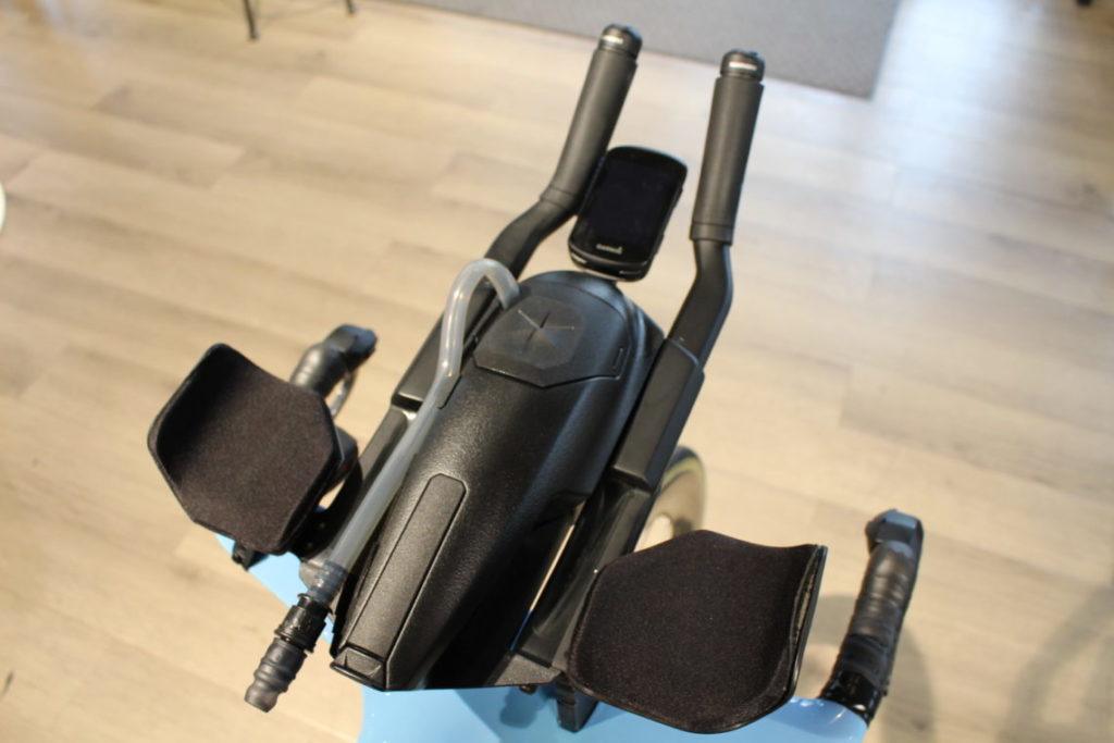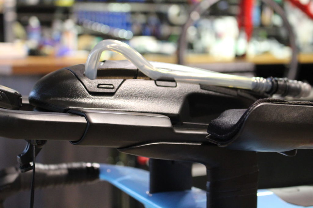DHポジションのまま水分補給できる専用の「BETWEEN-THE-ARMS ボトル(BTAボトル)」(別売り)がエアロ効果はもちろん、スマートで見た目もかっこいい。そしてストロー先端はロック機能も付いておりこぼれることもなく、軽く水吸えて飲みやすい。容量は約770ml入ります。