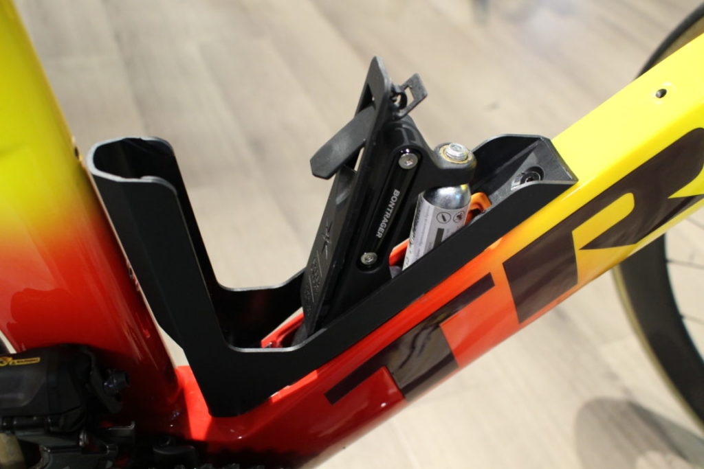 新型スピコンはトップチューブのフレーム内に収納できるようになっており深さもあり、見た目以上に中は大きいのでロングでも対応できる収納力になってます。しかも走行中飛び出すこともなく、出し入れもスムーズ。