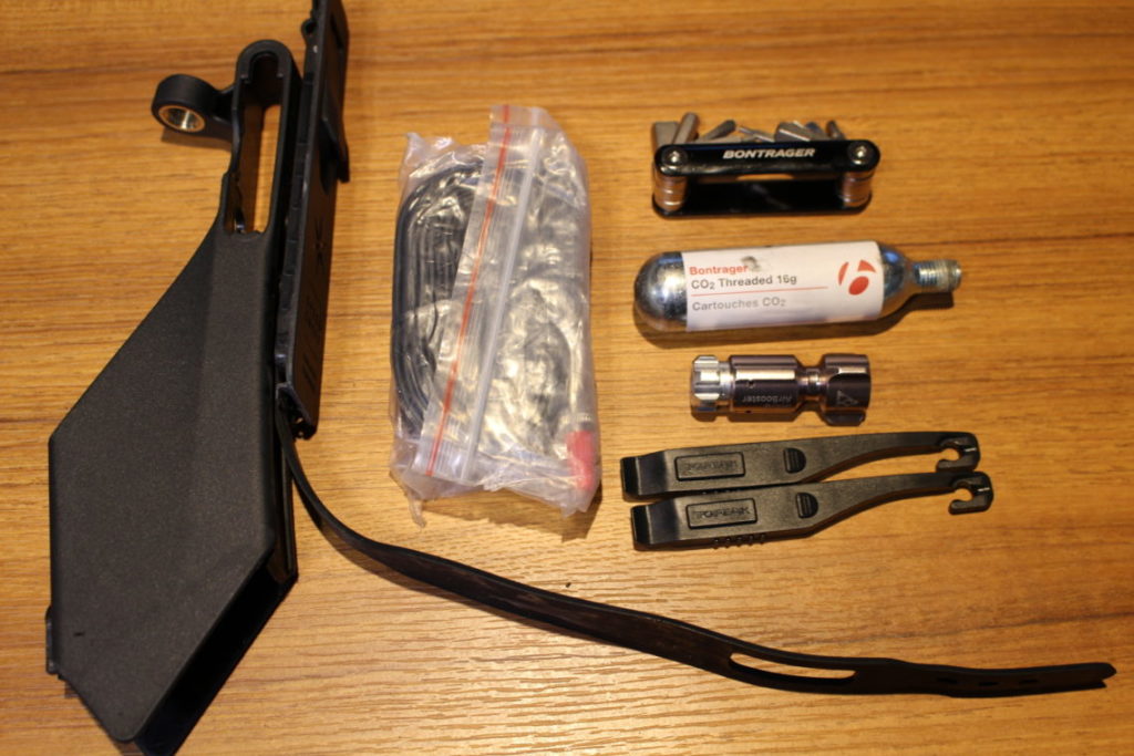 そしてパンク修理キッドですが、フレームダウンチューブ内に納めることができます。私のキッド内容ですがライトウェイトチューブ、タイヤレバー、CO2ボンベ、CO2インフレーター、コンパクトマルチツールを収納。この収納BOXにはバルブエクステンダーを交換するときに使用するバルブツールもついているので、いざという時は便利ですね。一番いいと思ったことは収納する場所がフレームの下、BBに近いところになるのでここに全部収まれば低重心化にもなりいい事だらけです。