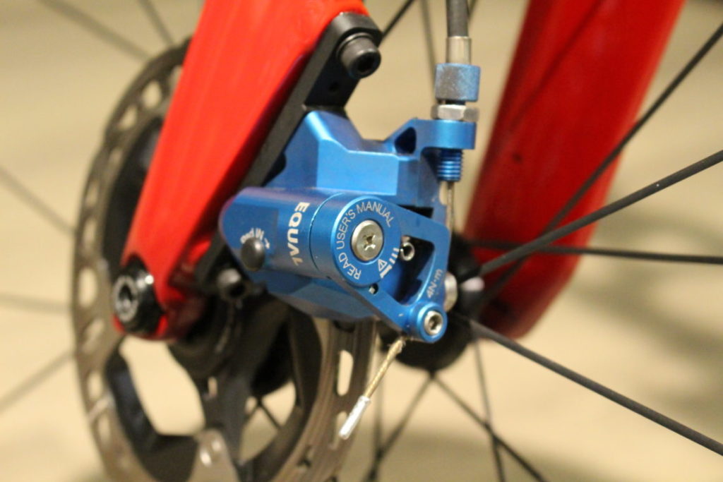通常油圧ディスクブレーキですが、私はテストもかねてMade in japanの「EQUAL」機械式(ワイヤータイプ)を使用しています。Made in japanだけあって、作りから性能までよく考えて作られており、引きも軽くて制動力は油圧式と変わりません。ただ、ワイヤーが伸びてくるのでこまめに点検調整は必要ですね。その分油圧式のほうが普段のメンテナンスは楽だと思います。