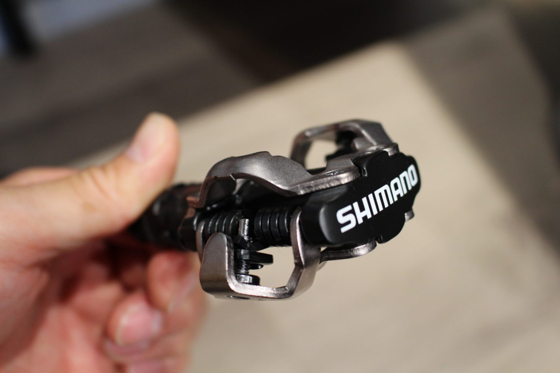 「シマノ SPDペダル」。ロード向けビィンデングペダルとの違いは小さいのと両面対応になっているのでシューズをつけるのが非常に簡単。