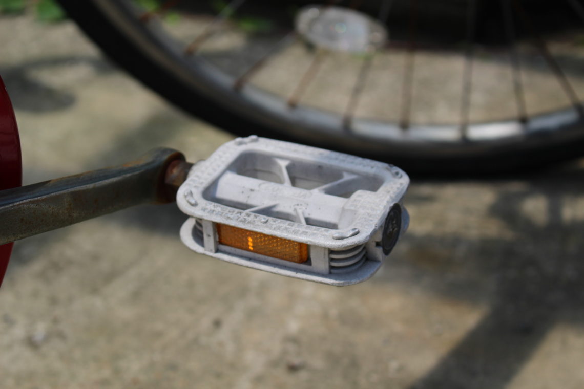 ママチャリ用ペダルですね。実はこれスポーツ用としてはあまり適していないんですよね。